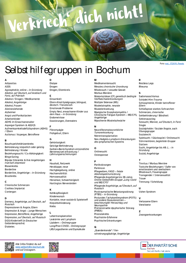 Hier finden Sie die Themenliste der Selbsthilfe-Kontaktstelle Bochum. Darin sind alle Themen gelistet, zu denen es aktuell Selbsthilfegruppen in Bochum gibt oder die sich in der Gründung befinden. Stand: März 2026